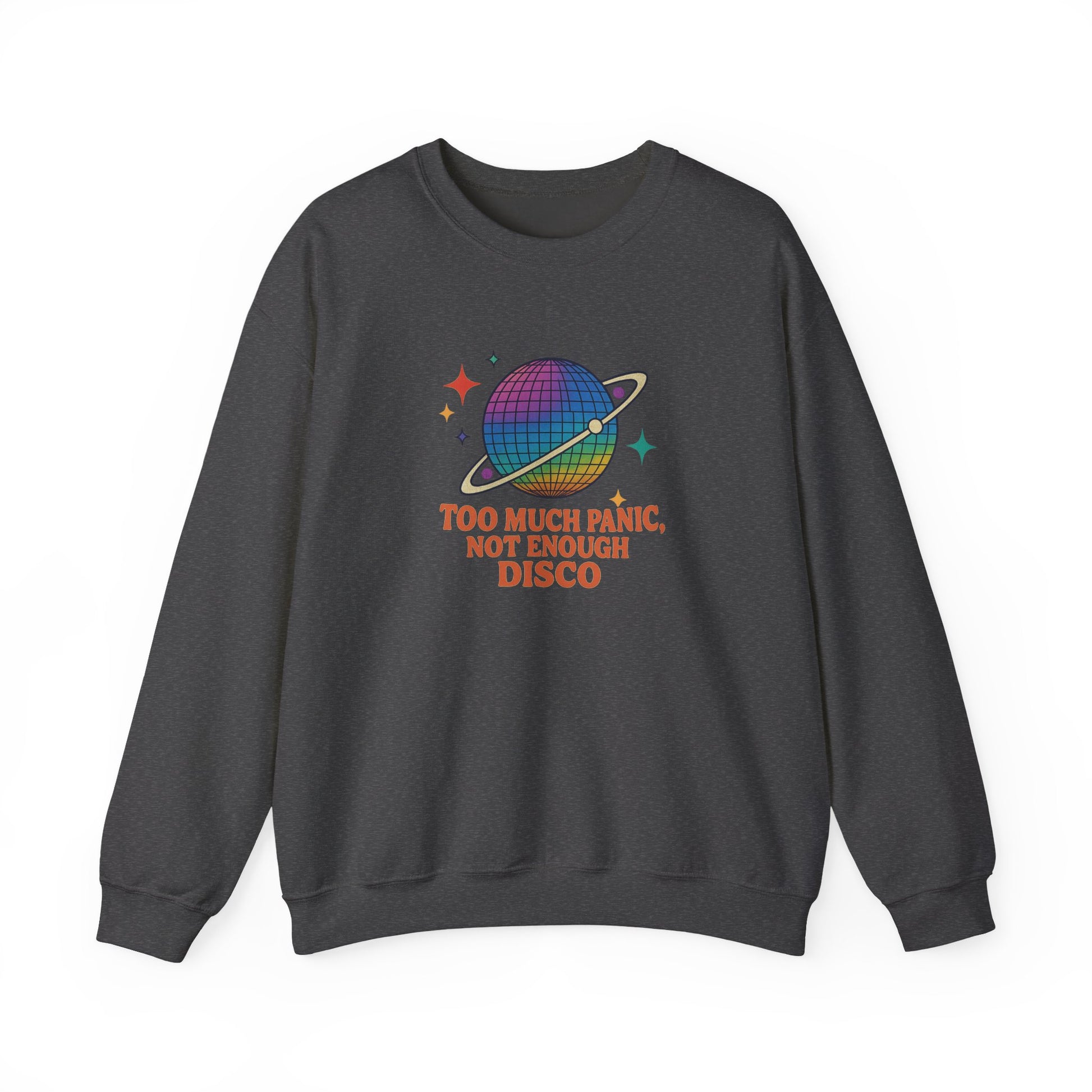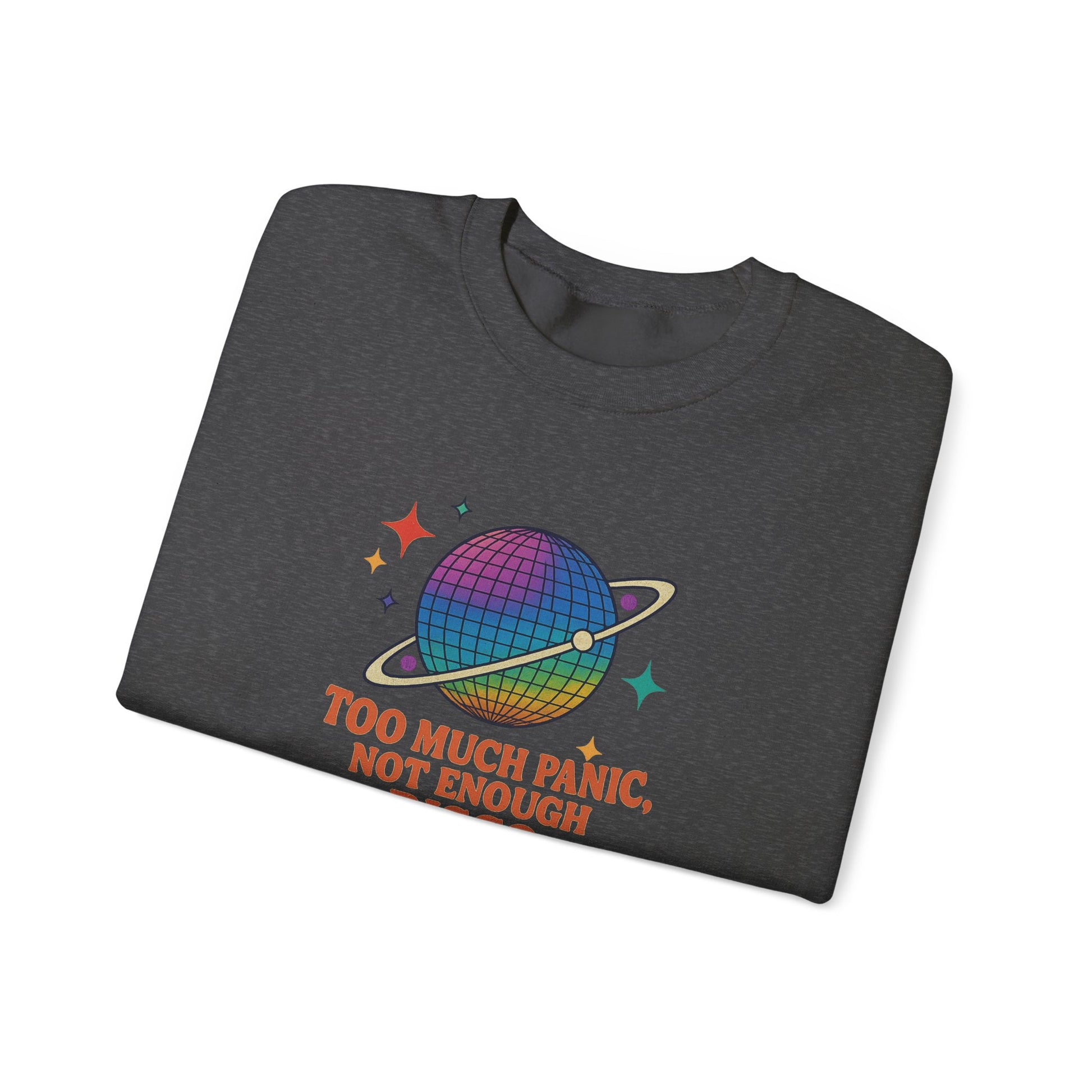 Stay cozy in the fall panic with this Too Much Panic, Not Enough Disco sweatshirt. Perfect for adults looking for a comfortable and stylish piece to wear during colder months. The classic fit and crew neckline provide a comfy wearing experience with top-tier durability. Say goodbye to itchiness with the tear-away label.
